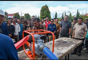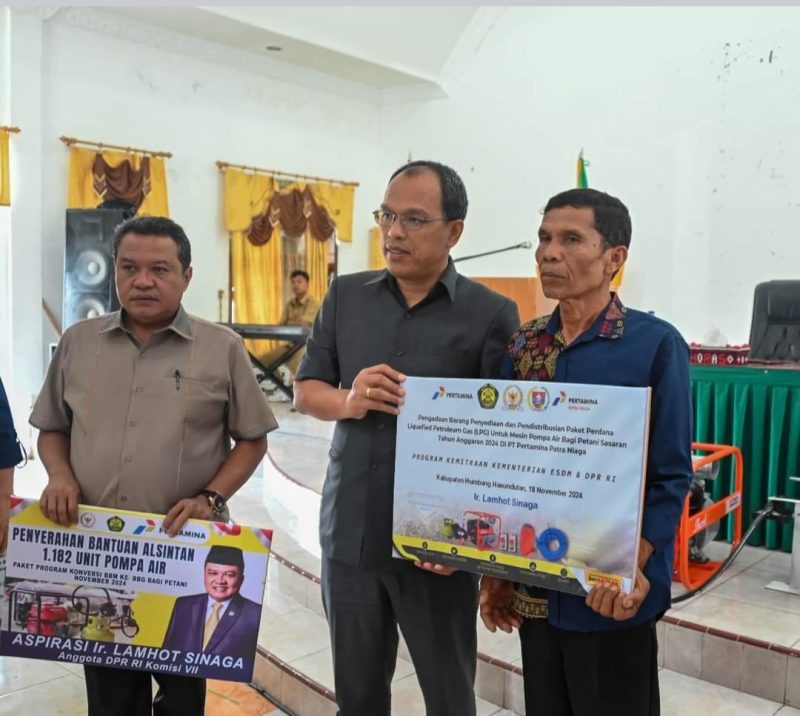 IDN Hari Ini, Humbang Hasundutan -Direktur Perencanaan dan Pembangunan Infrastruktur Minyak dan Gas Bumi Kementerian Energi dan Sumber Daya Mineral (KESDM) Laode Sulaeman bersama Wakil Ketua Komisi VII DPR-RI Ir Lamhot Sinaga, Bupati Humbahas Dosmar Banjarnahor, S.E dan lainnya menyerahkan bantuan sebanyak 1.182 unit mesin pompa air Paket Program Konversi BBM ke BBG bagi petani sasaran di Kabupaten Humbang Hasundutan bertempat di Pendopo Bukit Inspirasi Doloksanggul, Senin (18/11/2024)