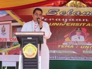 Acara Perayaan Dies Natalis diawali dengan Ibadah Ekaristi, langsung dipimpin oleh yang mulia Uskup KAM Mgr. Kornelius Sipayung, OMFCap. Beliau berpesan sesuai dengan Tema Dies Natalis : Unika Adalah Rumah Kita, “Jika dalam rumah seseorang mengalami kasih, maka dia akan sanggup memberikan kasih diluar rumah, rumah adalah tempat damai, maka mari kita jadikan kampus ini menjadi rumah kita yang mendatangkan kedamaian,” pesannya