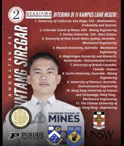 Sementara itu, Bintang Lamjaya Siregar diterima di kampus-kampus bergengsi seperti University of California San Diego (AS), Purdue University (AS), University of New South Wales (Australia), hingga Hongkong University of Science and Technology.