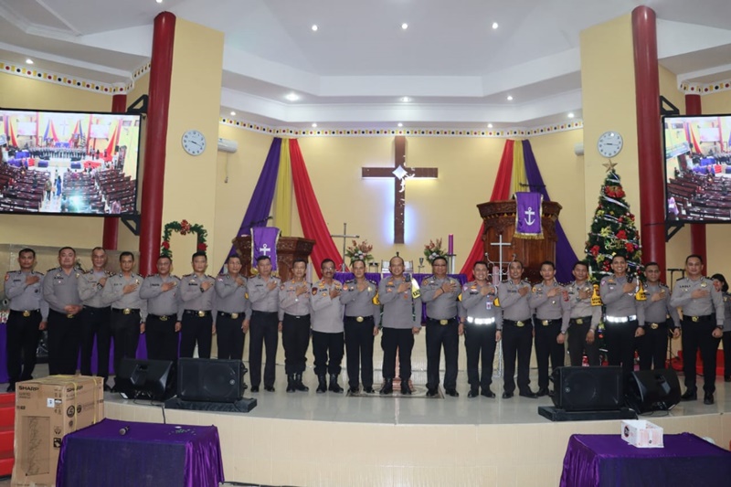 Gunungsitoli, indonesiahariini – Polres  Nias Melaksanakan Perayaan Natal tahun 2023, Perayaan Natal  Keluarga besar  Polres Nias di Laksanakan di Gereja BNKP Resort I Kota Gunungsitoli, Pada Pelaksanaan Perayaan Natal Keluarga besar Polres Nias mengambil  Tema:      KEMULIAAN BAGI ALLAH DAN DAMAI SEJAHTERA DI BUMI (LUKAS 2:14) sedangkan Sub Tema adalah : “Dengan Semangat  Kerendahan Hati, Menyambut Kelahiran Kristus Melalui Peran Polri  Presisi, Berintegritas, Mengasihi dan Melayani guna Mewujudkan Pemilu Damai Menuju Indonesia Maju”    Pembawa Renungan adalah  Pdt. Weli Kristina Eliku Putri Gulo, S.Th, 07/12/2023.