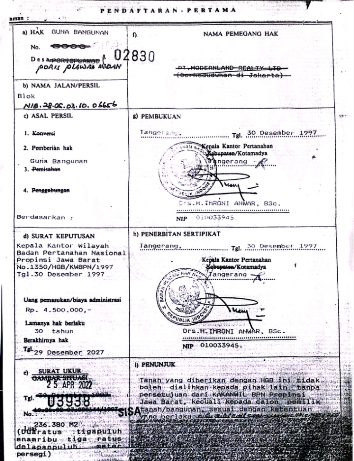 Salah satu kasus yang perlu disorot adalah perubahan status Hak Guna Bangunan (HGB) Nomor 02830/Poris Plawad Indah dengan Nomor Identifikasi Bidang (NIB) 06656.