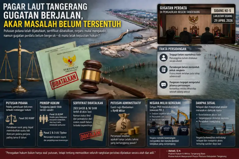 IDN Hari Ini, Kabupaten Tangerang — Kasus pagar laut di kawasan pesisir Pantai Utara Kabupaten Tangerang, yang bersinggungan dengan pengembangan kawasan PIK 2, hingga kini belum menunjukkan penyelesaian yang utuh.