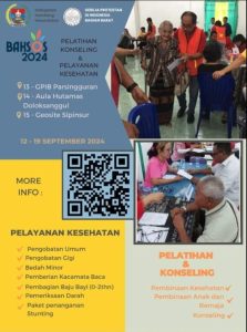 Pelayanan yang diberikan pada Bakti Sosial 2024 ini antara lain pelatihan konseling yaitu pembinaan kesehatan, pembinaan anak dan remaja serta konseling. Pelayanan kesehatan yaitu pengobatan umum, pengobatan gigi, bedah minor, pemberian kacamata baca, pembagian baju bayi (0-2 thn), pemeriksaan darah dan paket penanganan stunting.