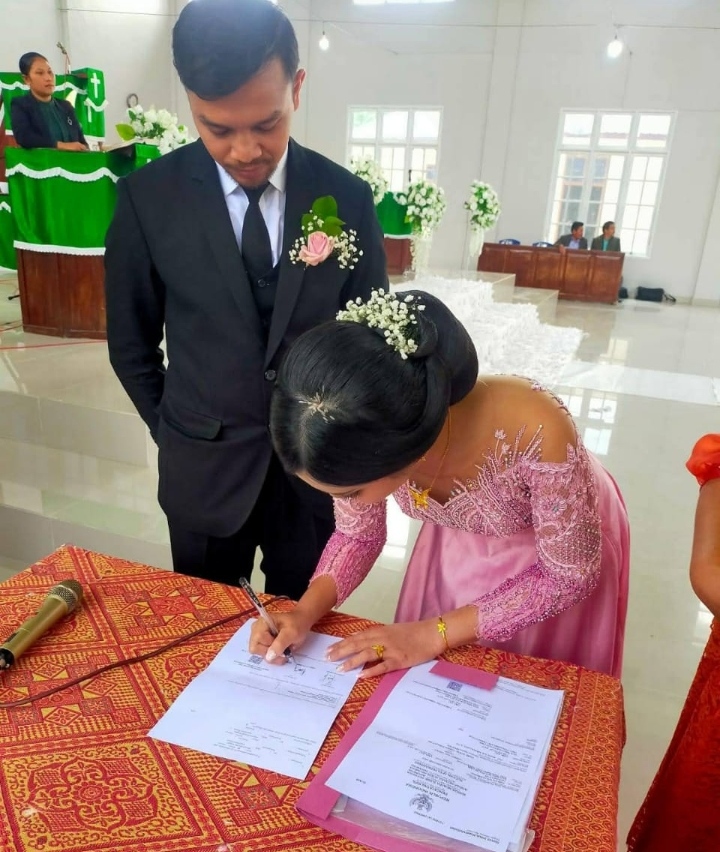 Setelah mendapatkan pemberkatan nikah dari Pendeta Candra Simanjuntak STh, kedua mempelai menerima akta pernikahan secara langsung di gereja, sebagai bagian dari pelayanan SIPALAWIJA EXTRA yang diinisiasi oleh Disdukcapil Humbahas.